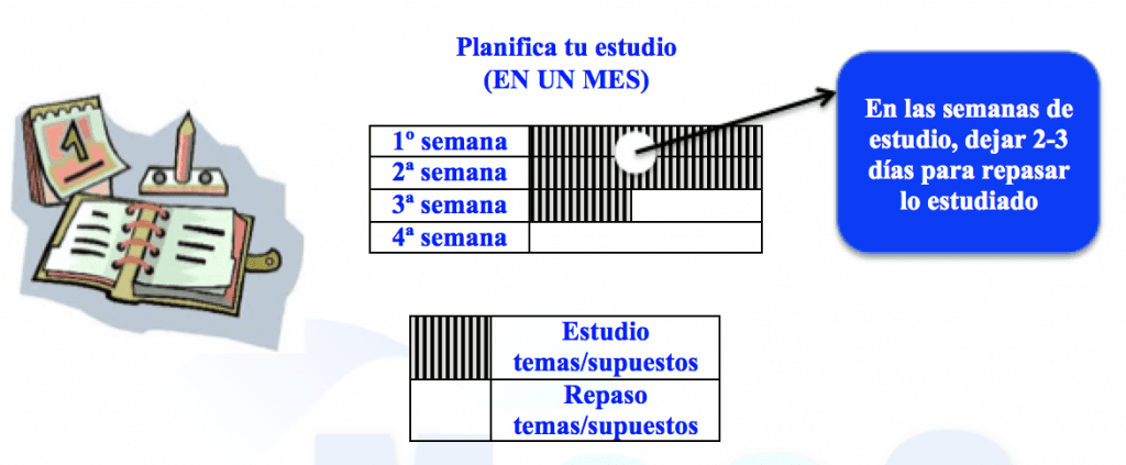 - ¿Cómo estudiar el temario/supuestos y repaso de los mismos? Aconsejamos que en las 2-3 primeras semanas del mes abordes el estudio del mayor número de temas/supuestos nuevos, para dejar la 3ª- 4ª semana de repaso (de todo lo estudiado).