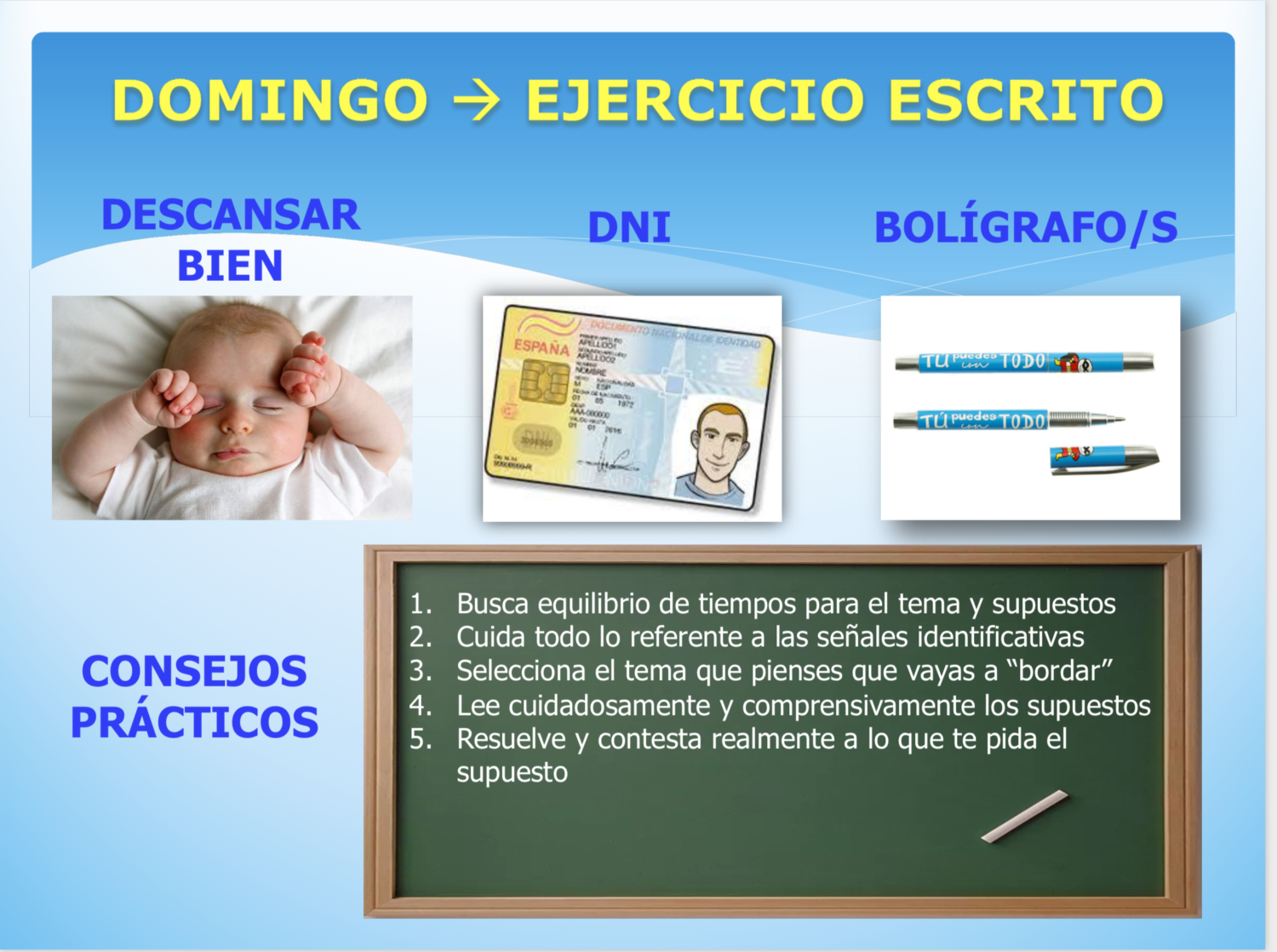 Preparados, listos… ¡YA! Queda menos de una semana para que comience el proceso selectivo y los nervios están a flor de piel. Son muchas las dudas y preguntas que nos hacemos por estas fechas, por lo que es interesante hacer un repaso de todo aquello que debemos tener presente en el día de la presentación y nuestro primer ejercicio (el escrito: tema y supuesto).