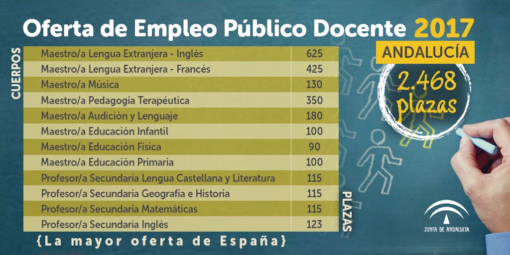 Del total de puestos, 2.000 son para el Cuerpo de Maestros y se distribuyen entre las especialidades de Lengua Extranjera-Inglés (625), Lengua Extranjera-Francés (425); Música (130); Pedagogía Terapéutica (350), y Audición y Lenguaje (180), cuyas convocatorias se efectuarán este año, y las de Educación Infantil (100), Primaria (100) y Educación Física (90), que se realizarán en ejercicios posteriores.
