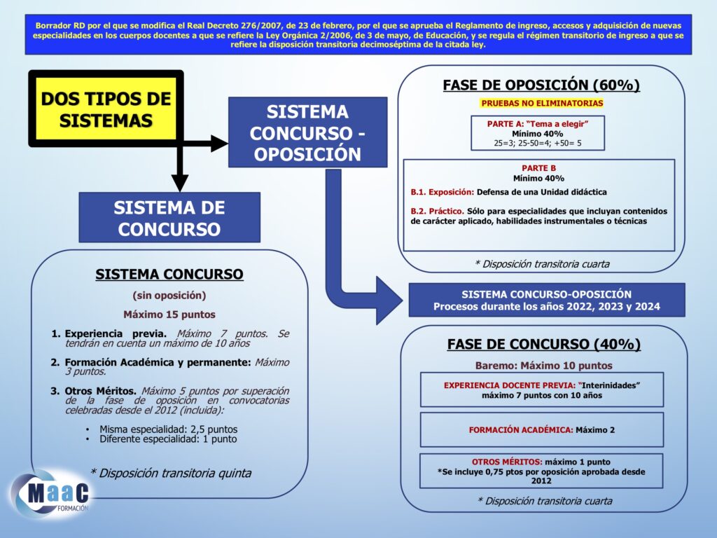 Como novedad respecto al borrador por el que se modifica el acceso a los cuerpos docentes, se mantendrá un proceso paralelo que se regirá por el sistema actual de concurso-oposición (desarrollo de un Tema, Prueba Práctica, presentación de la Programación y exposición y defensa de la Unidad Didáctica) con las plazas de reposición y de nueva creación.