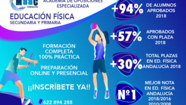Si estás leyendo este post es que te has planteado presentarte a las oposiciones al Cuerpo de Secundaria que tendrán lugar en 2020 por la especialidad de Educación Física. ¡Enhorabuena! Es un gran paso en tu carrera profesional que esperemos te reporte el éxito esperado. Si es la primera vez que te presentas y andas algo perdido en este campo, en MaaCFormación, como solemos hacer, vamos a ir paso a paso. Primero te explicamos el proceso en este video, y además podrás descargar un archivo PDF con un resumen del proceso de oposición en este enlace. Igualmente, te puede ser de gran ayuda nuestra guía del opositor, completamente gratuita para descargar, en la que podrás encontrar consejos y orientaciones para tu preparación. En MaaCFormación, cubrimos de forma específica la formación de Educación Física tanto en primaria, como en secundaria, siendo ésta, la especialidad con la que empezamos nuestra andadura en Granada hace más de 20 años. Es nuestra especialidad, en la que llevamos centrados todos estos años, innovando en la metodología, pendientes de cada cambio de legislación y novedades educativas, y en la que mejores resultados obtienen nuestros opositores. Educación Física, como sabes, es una especialidad que cuenta con ciertas particularidades y diferencias con respecto a otras materias. Nuestra experiencia nos dice que muchos opositores se encuentran con la problemática de encontrar un preparador adecuado, que aporte un temario completo y actualizado, supuestos resueltos y las pautas más útiles para destacar en tu ejercicio oral. Miguel Ángel Aguilar Cruz, preparador de MaaCFormación, que ha dedicado su carrera como preparador de oposiciones en la especialidad de Educación Física, ha logrado posicionar a MaaCFormación como uno de los centros de referencia en toda Andalucía. En 2018, ocho de nuestros alumnos se posicionaron como Nº 1 en sus respectivos tribunales y siete ocuparon la 2ª mejor nota. Igualmente, podemos alegrarnos de que nuestro alumnado ha conseguido ser el mejor a nivel andaluz. Nos avalan, nuestros resultados, donde la mejor nota en Andalucía en todas las pasadas convocatorias, en la Especialidad de Educación Física Secundaria, 2008, 2010, 2016 y 2018, fue para alumnos de MaaCFormación. Más del 94% de nuestros alumnos aprueban la oposición y más de la mitad de éstos, un 57% lo hacen con plaza. En total, los alumnos de MaaCFormación ocuparon más de un 30% total de las plazas ofertadas en Educación Física en Andalucía, es decir, que 3 de cada 10 plazas ofertadas la consigue nuestros alumnado. En MaaCFormación no hacemos milagros y si nuestro método funciona es gracias a nuestros alumnos. Nosotros tan sólo os ofrecemos las herramientas para que seas capaz de explotar tus conocimientos y optimizar tus esfuerzos para conseguir los mejores resultados. Ofrecemos una formación completa, 100% práctica y con un seguimiento personalizado durante todo el curso. Impartimos clases en Granada de forma presencial y modalidad online para aquellos que prefieran organizarse los horarios o cuenten con otras responsabilidades. Estamos seguros que con nuestra preparación serás capaz de ofrecer lo mejor de ti mismo como docente. Si aún necesitas más información sobre nuestro método de estudio, consulta este tema y esquema de muestra de la especialidad de Educación Física Secundaria. TEMA ESCRITO ESQUEMA Inscríbete ahora y aprovecha el verano para comenzar ya con la formación Asegura así tu plaza para Septiembre. CONTACTA CON MAACFORMACIÓN Nos pondremos en contacto contigo y resolveremos todas tus dudas antes de que hagas ningún pago. Recuerda que no cobramos matrícula y, por tanto, ahora sólo pagarás el material que recibas. De este modo, podrás empezar tu preparación desde hoy. Las clases darán comienzo en Septiembre, tanto en modalidad presencial como online. En ese momento, te daremos acceso a nuestra plataforma online. Ahora, estamos trabajando para actualizar contenidos y recursos.